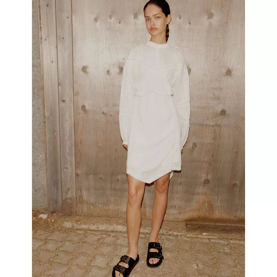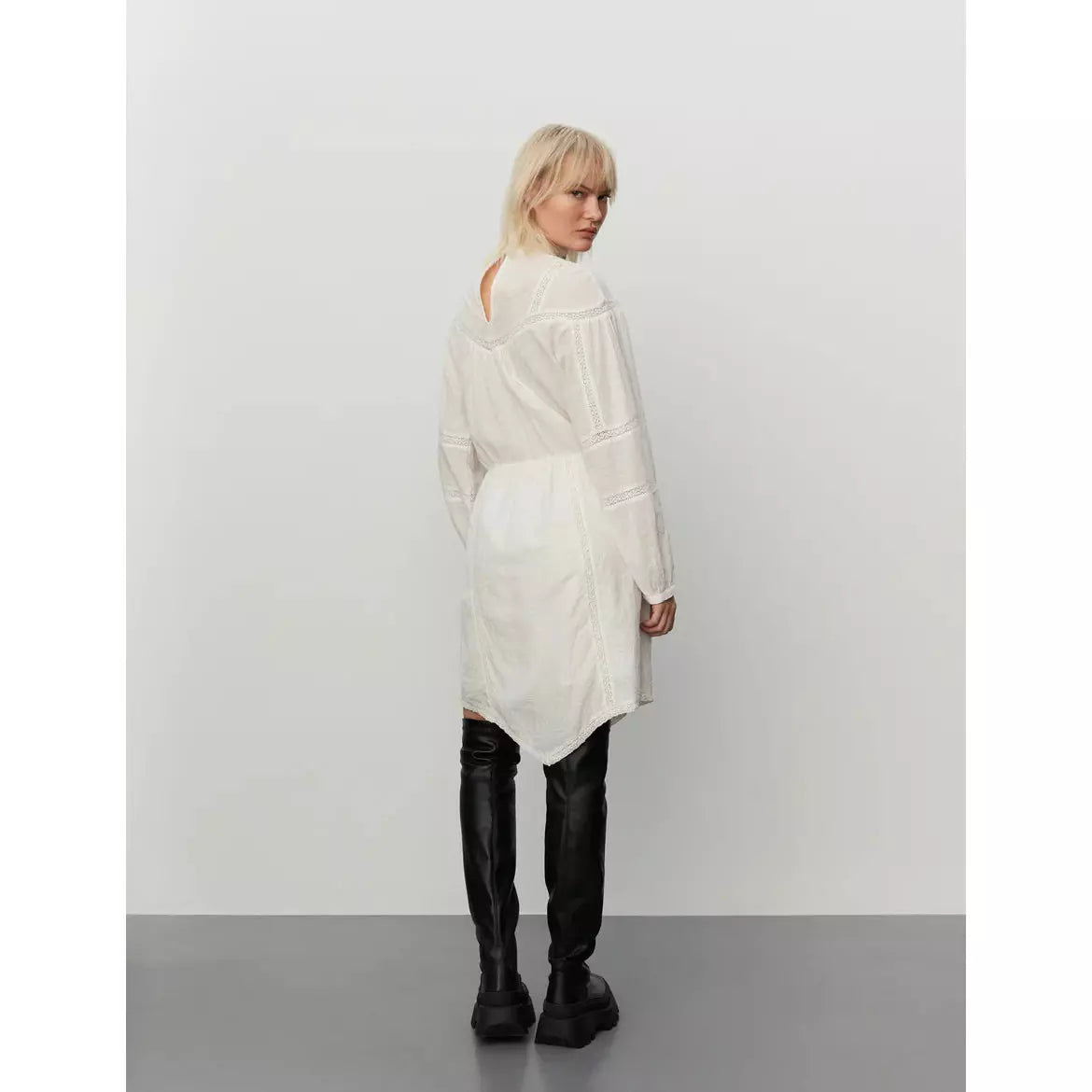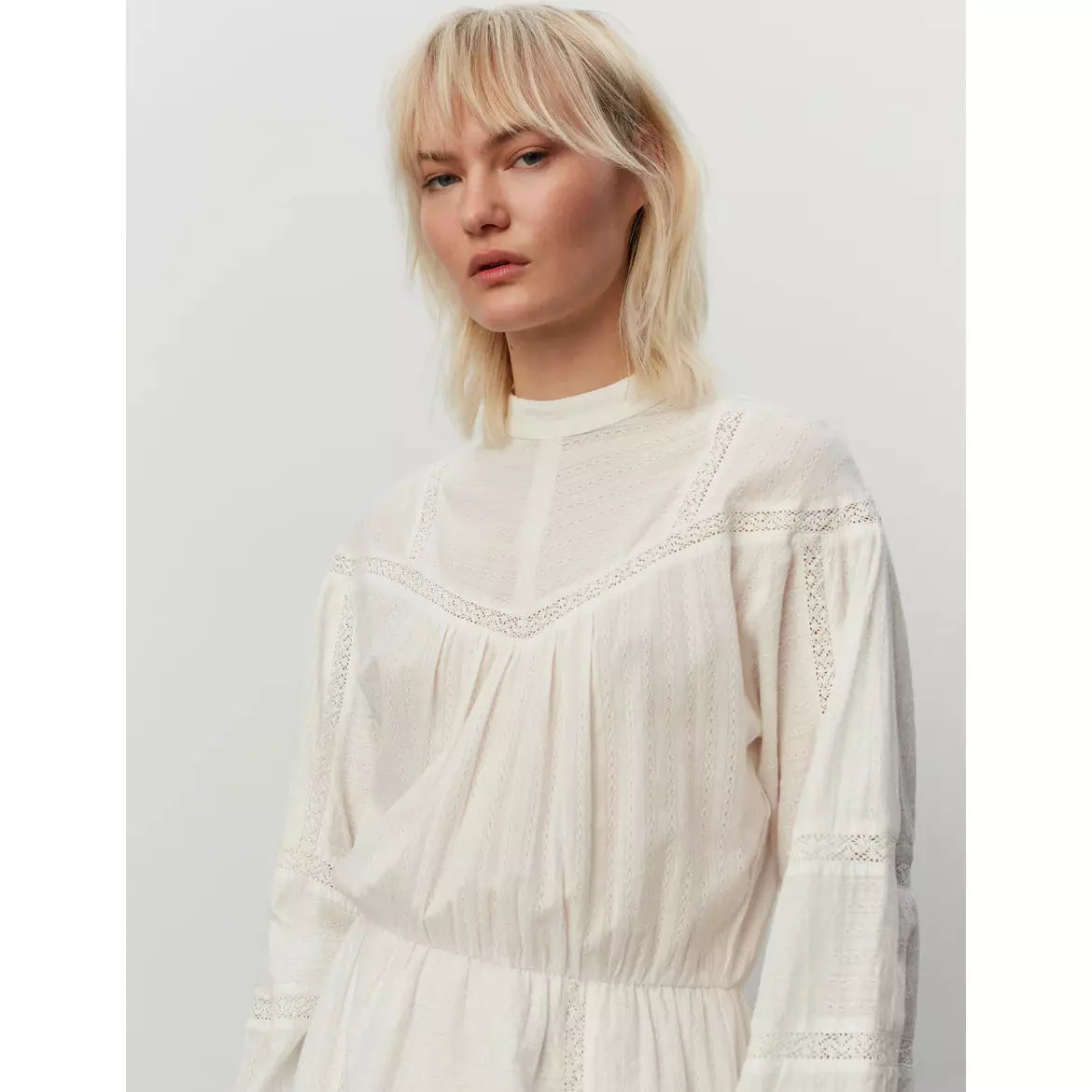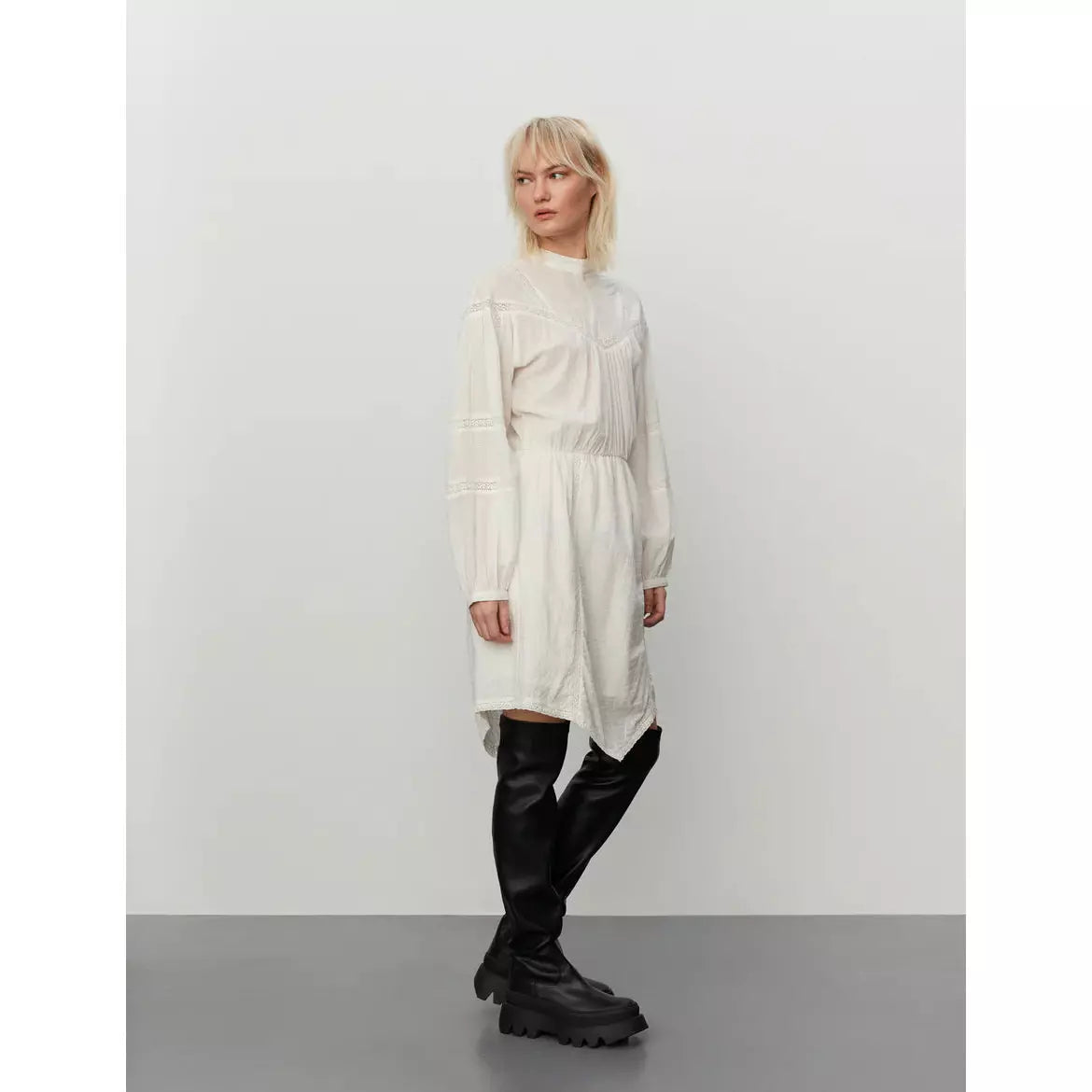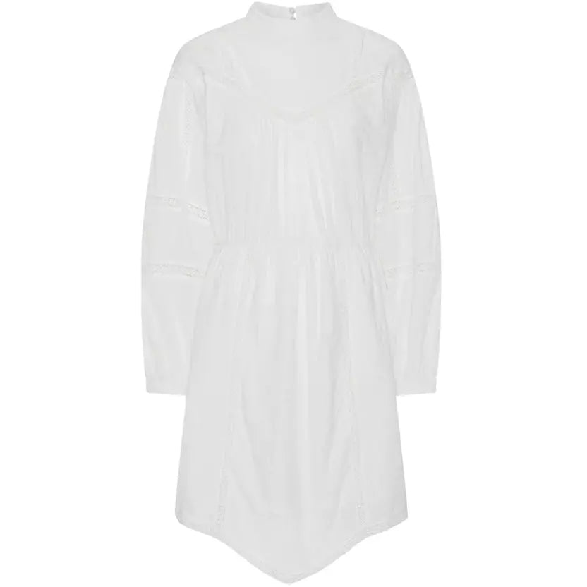 Fin vit klänning i 100% bomull. Hög hals med knäppning i nacken. Fina spetsdetaljer som löper längst med bröstet & på ärmarna. Lång ballongärm & markerad midja i resår. Knälång modell med en snygg assymmetrisk form nedtill.