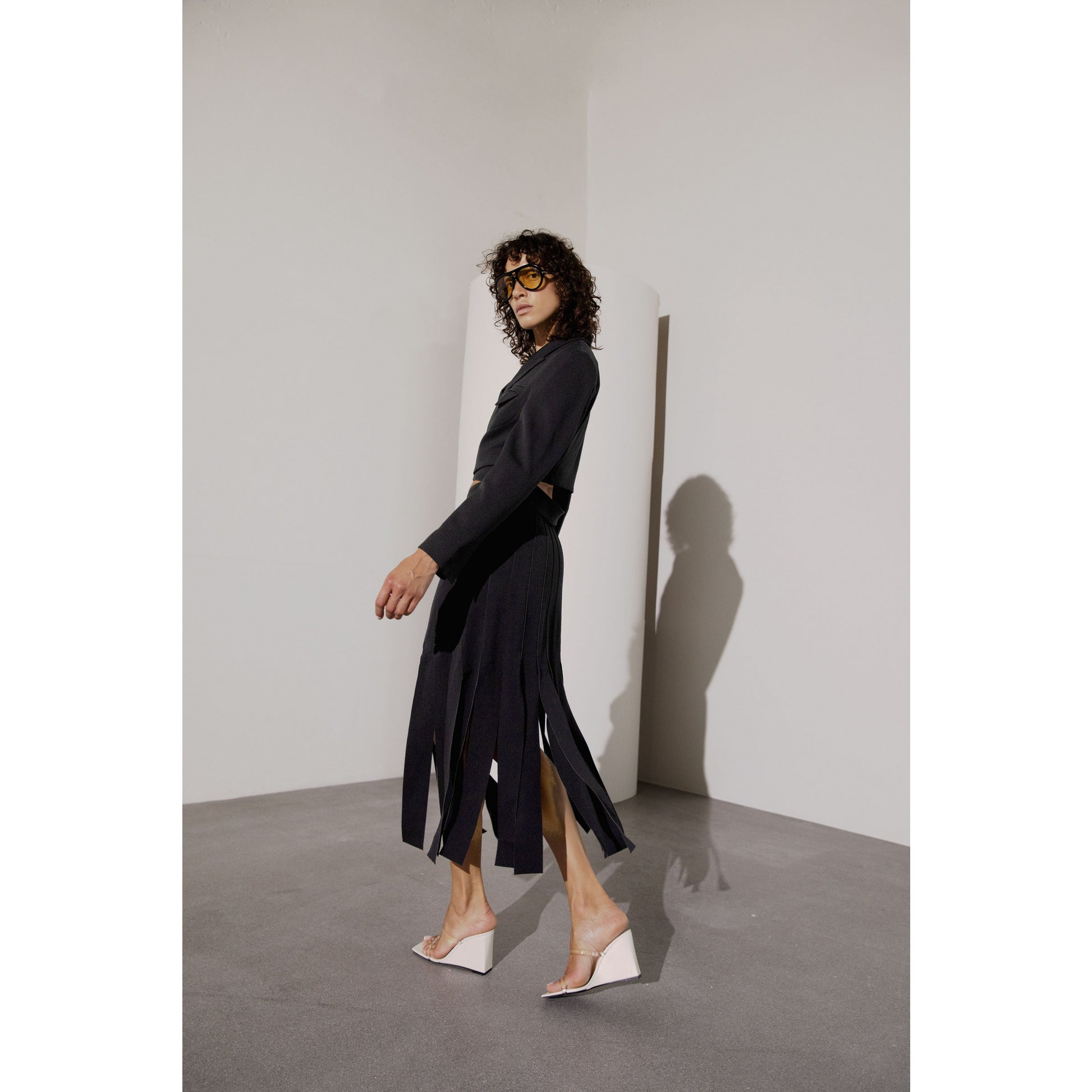 Kjol med läcker drapering nedtill som ger en fransliknande effekt. Tight hög midja. Passar lika bra till en klack eller sandal under vår- & sommaren, som till ett par chunky boots under hösten- & vintern.