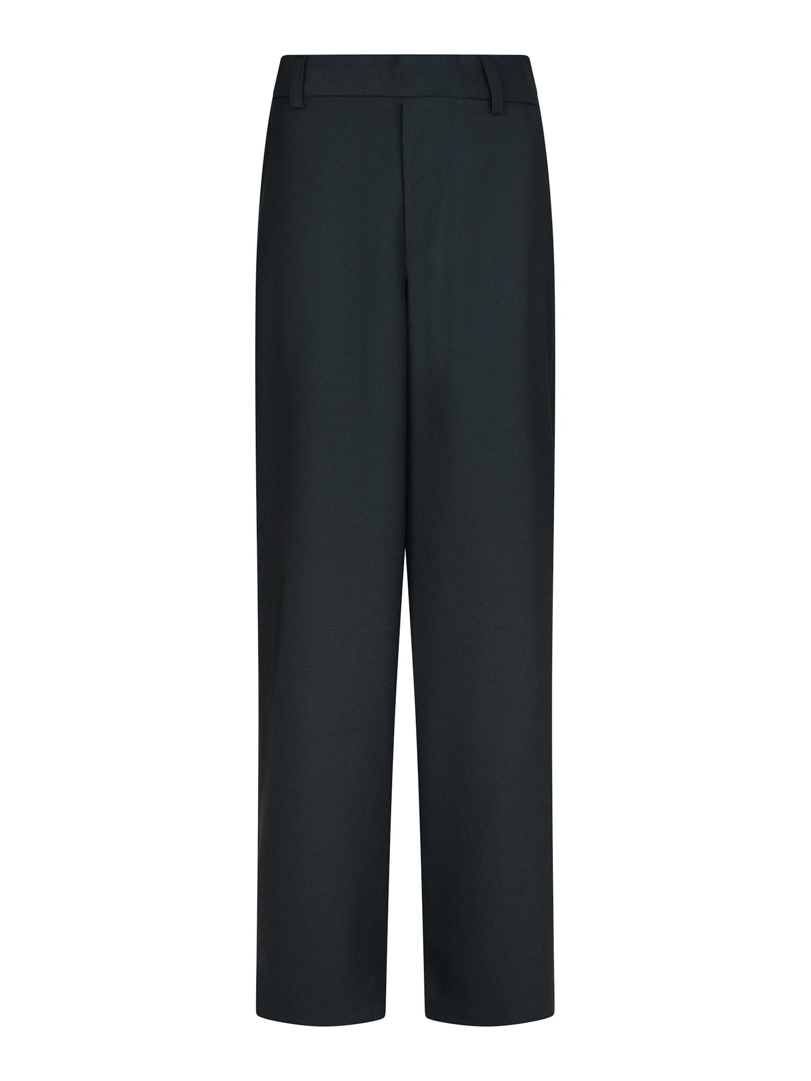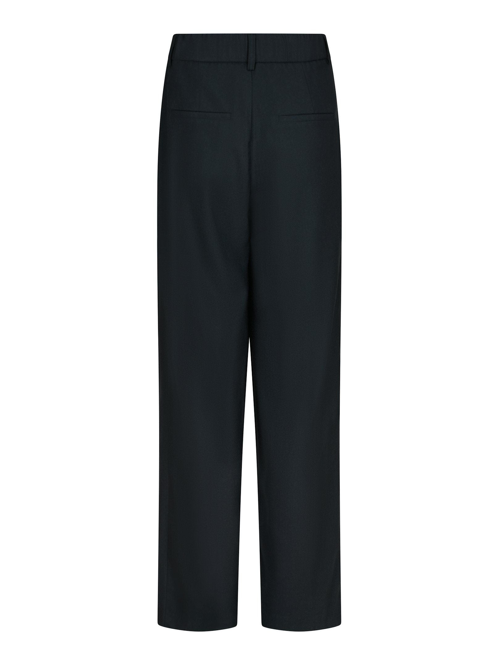 Marinblå kostymbyxa med hög midja och vida ben. Sneda sidofickor och hällor. Förslutning med gylf och knäppning.