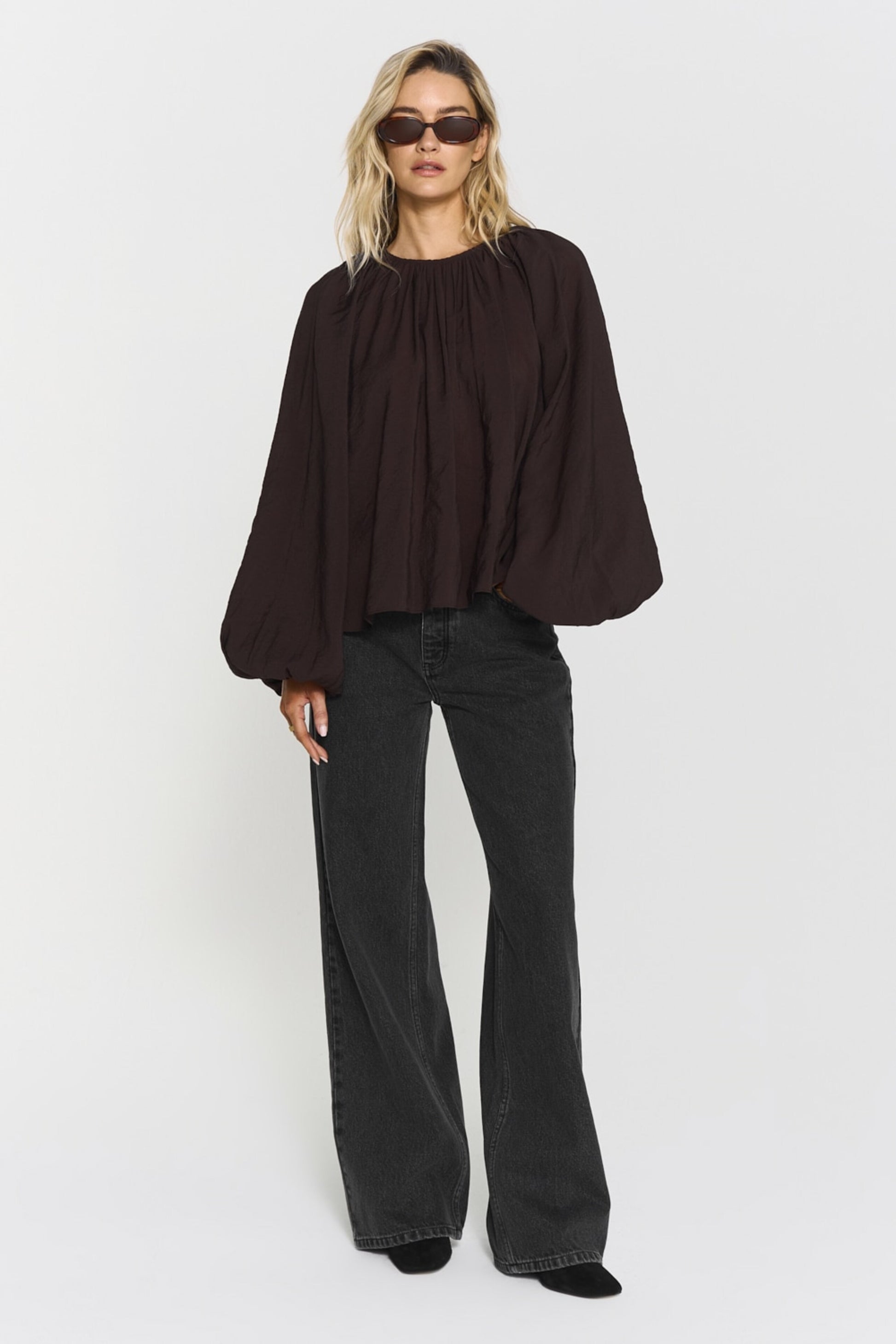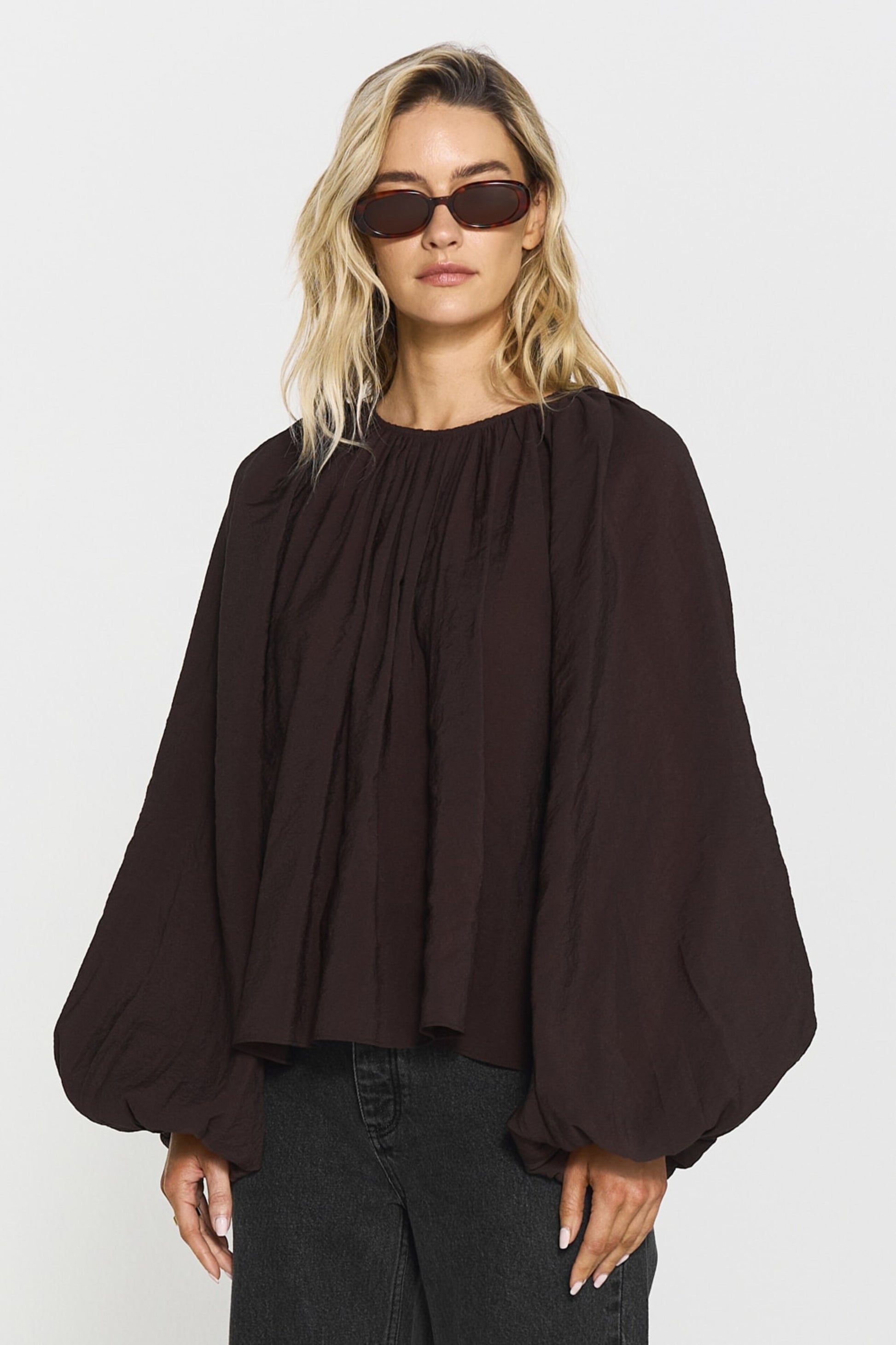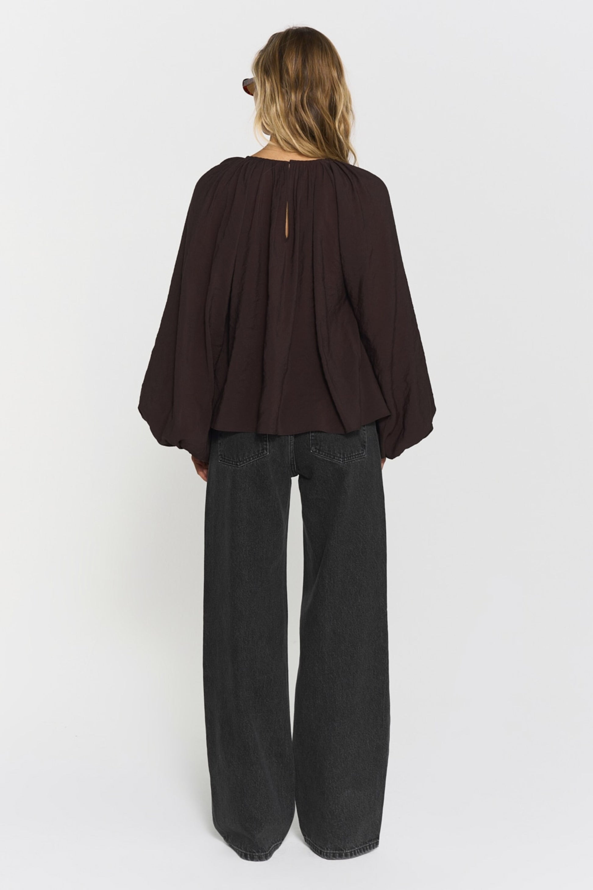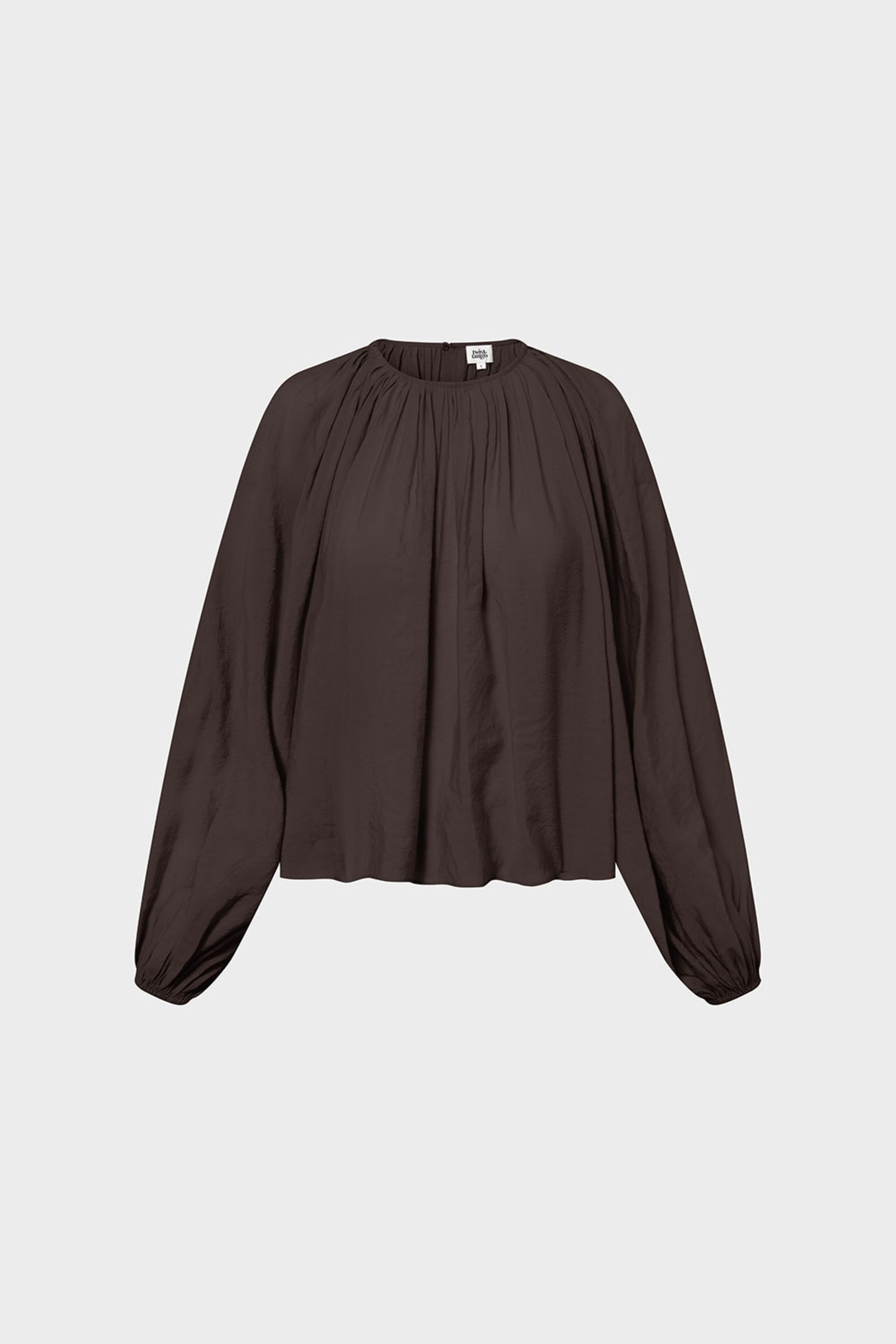 Blus i en fin mörkbrun färg. Elegant blus med stora ballongärmar och rundad hals med fin drapering. Ett tunt följsamt material som gör att blusen faller vackert.