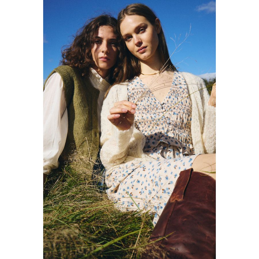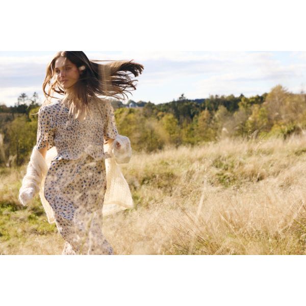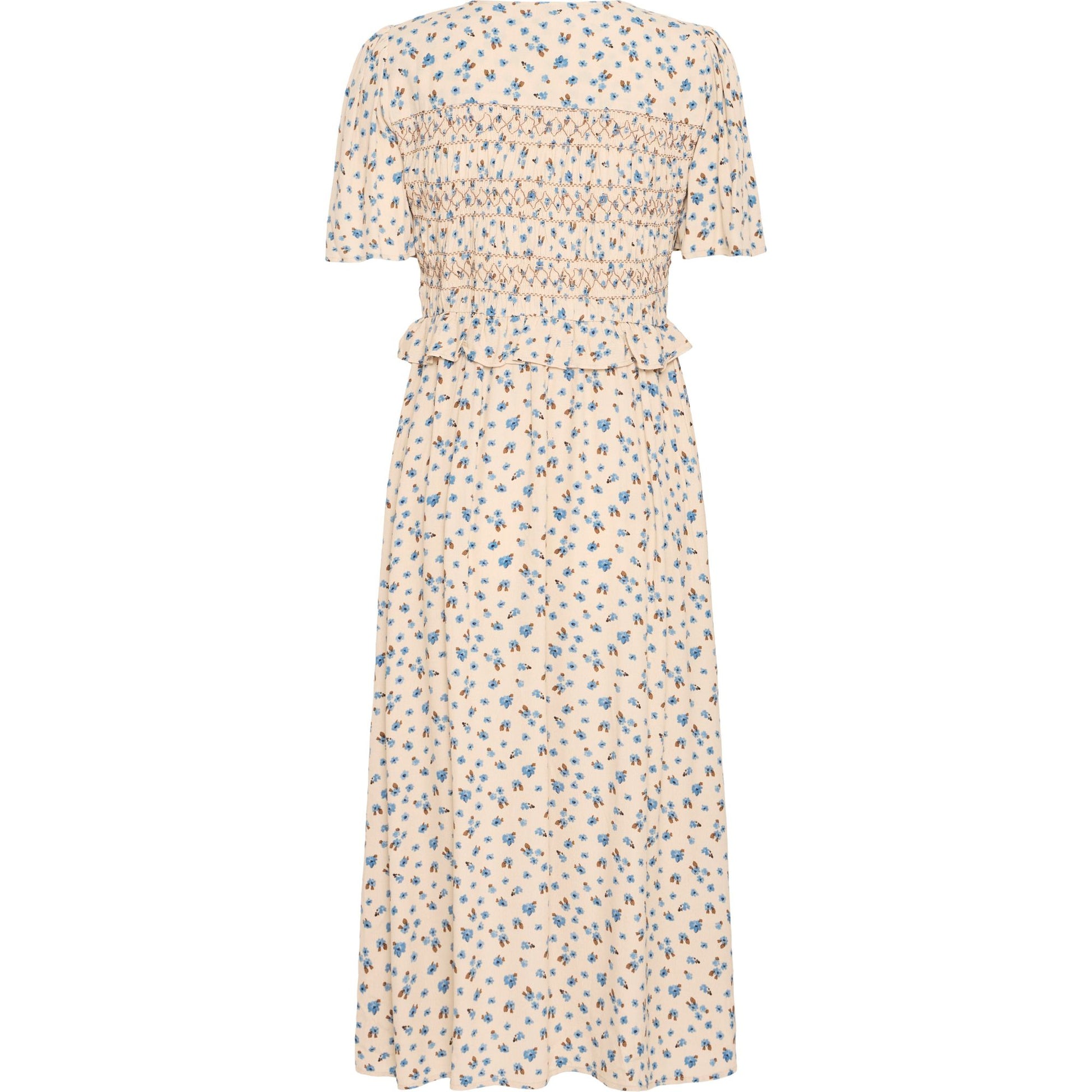 Ljus klänning i ett sött blommönster i blått och brunt. V-ringad hals, fin smock upptill vid bysten samt söt volangkant vid midjan. Kort lös ärm.