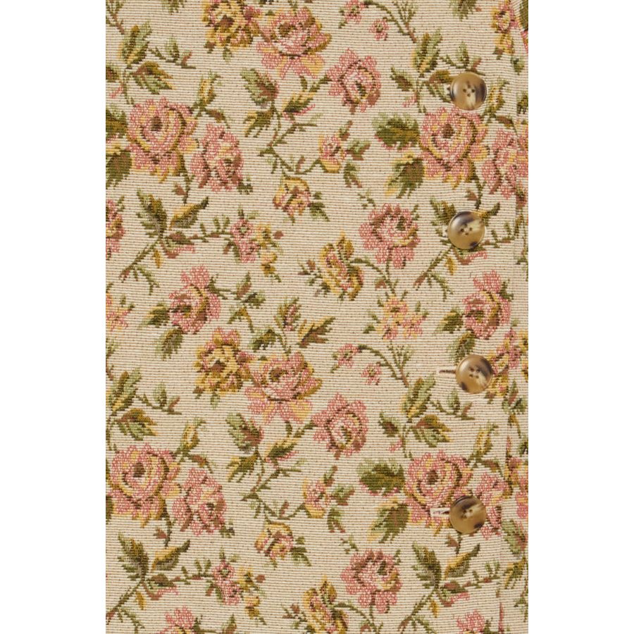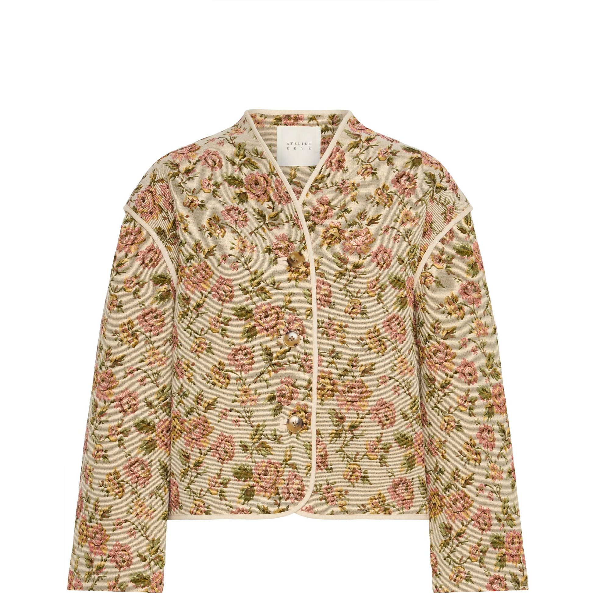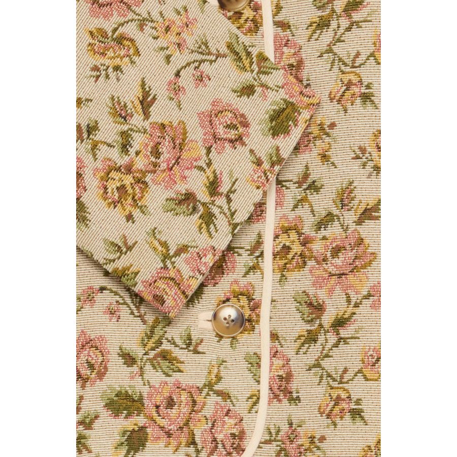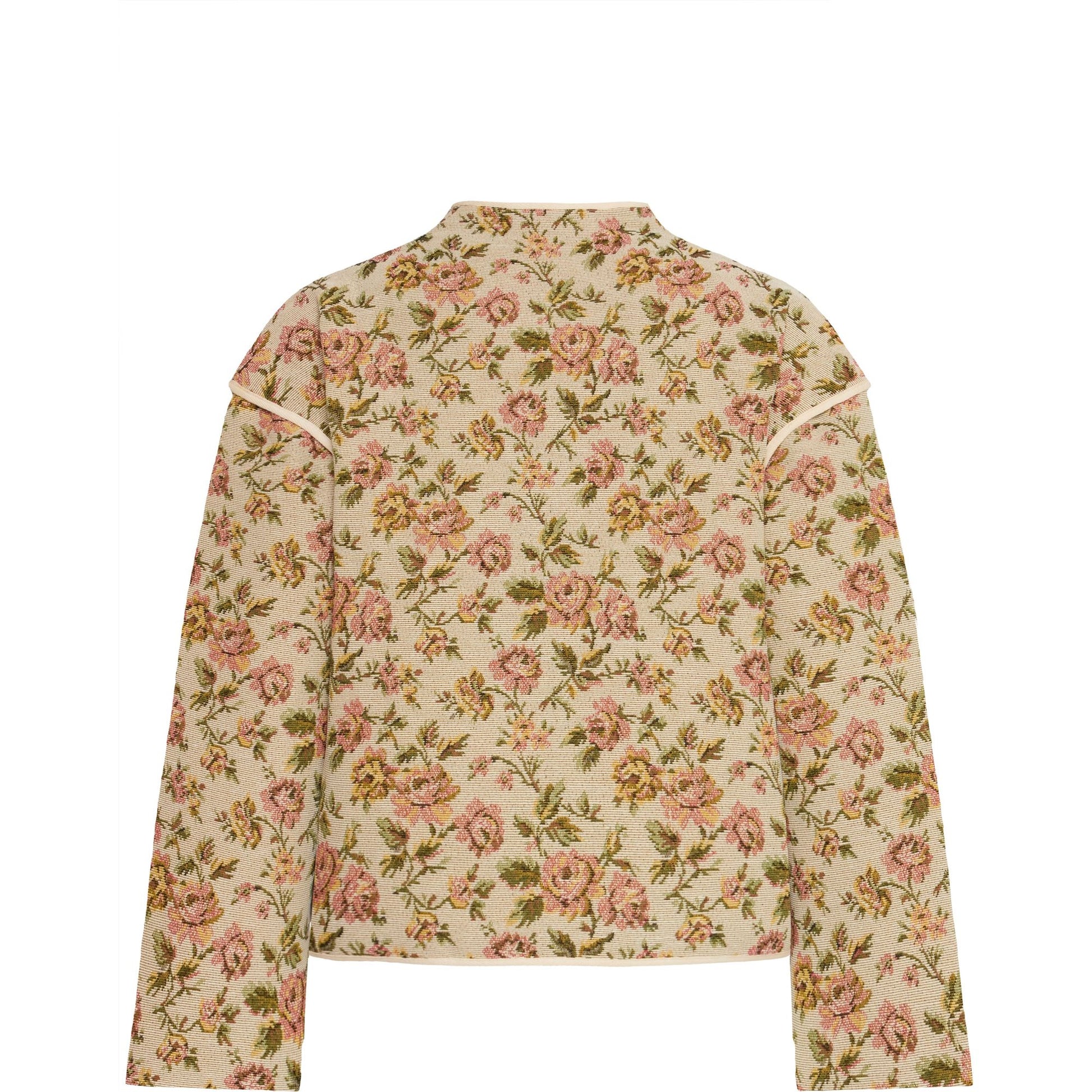 Romantiskt blommönstrad jacka. V-ringad hals med sned knäppning framtill. Droppad axel och lång vid ärm. Kortare modell med en rak lös passform. Fint gammelrosa foder.