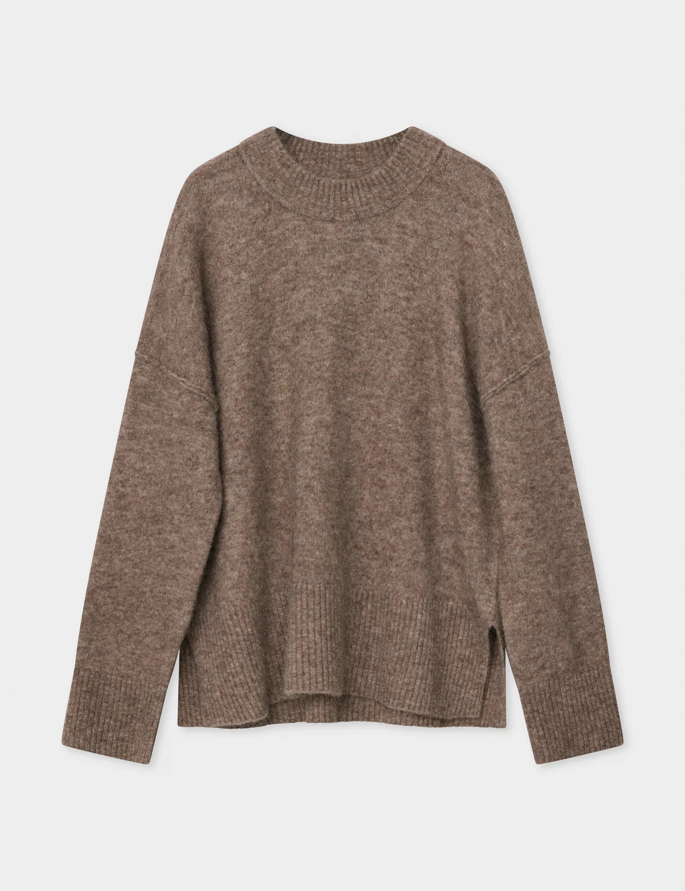 Stickad oversize tröja i en fin brunfärg! Rundad hals med bred mudd. Lång vid ärm med droppade axlar & bred ribbad mudd vid ärmslut. Rak modell med liten slits i båda sidorna. Bred ribbad kant nedtill på tröjan.