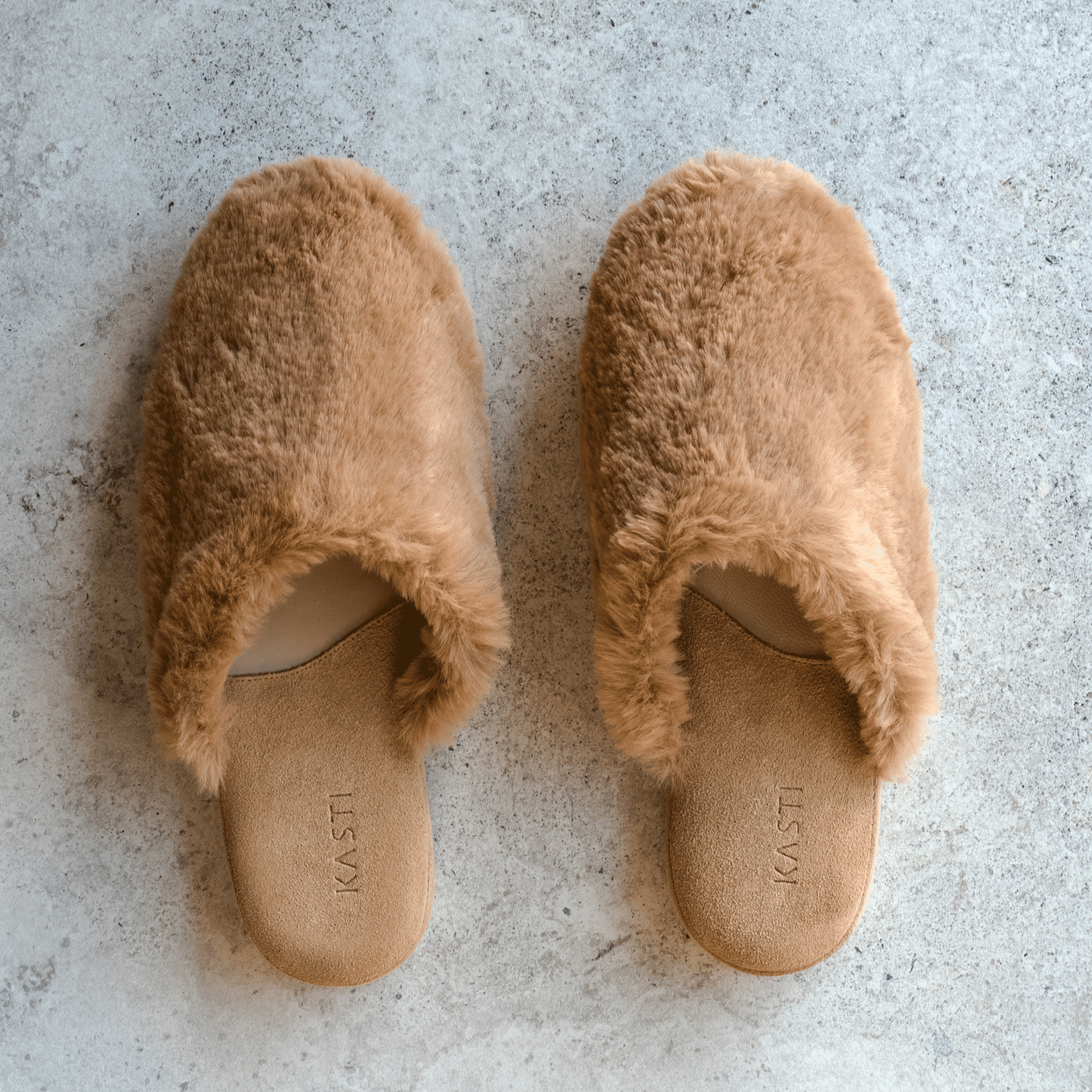 Beiga slip-in-tofflor med mysig päls från märket Kasti.