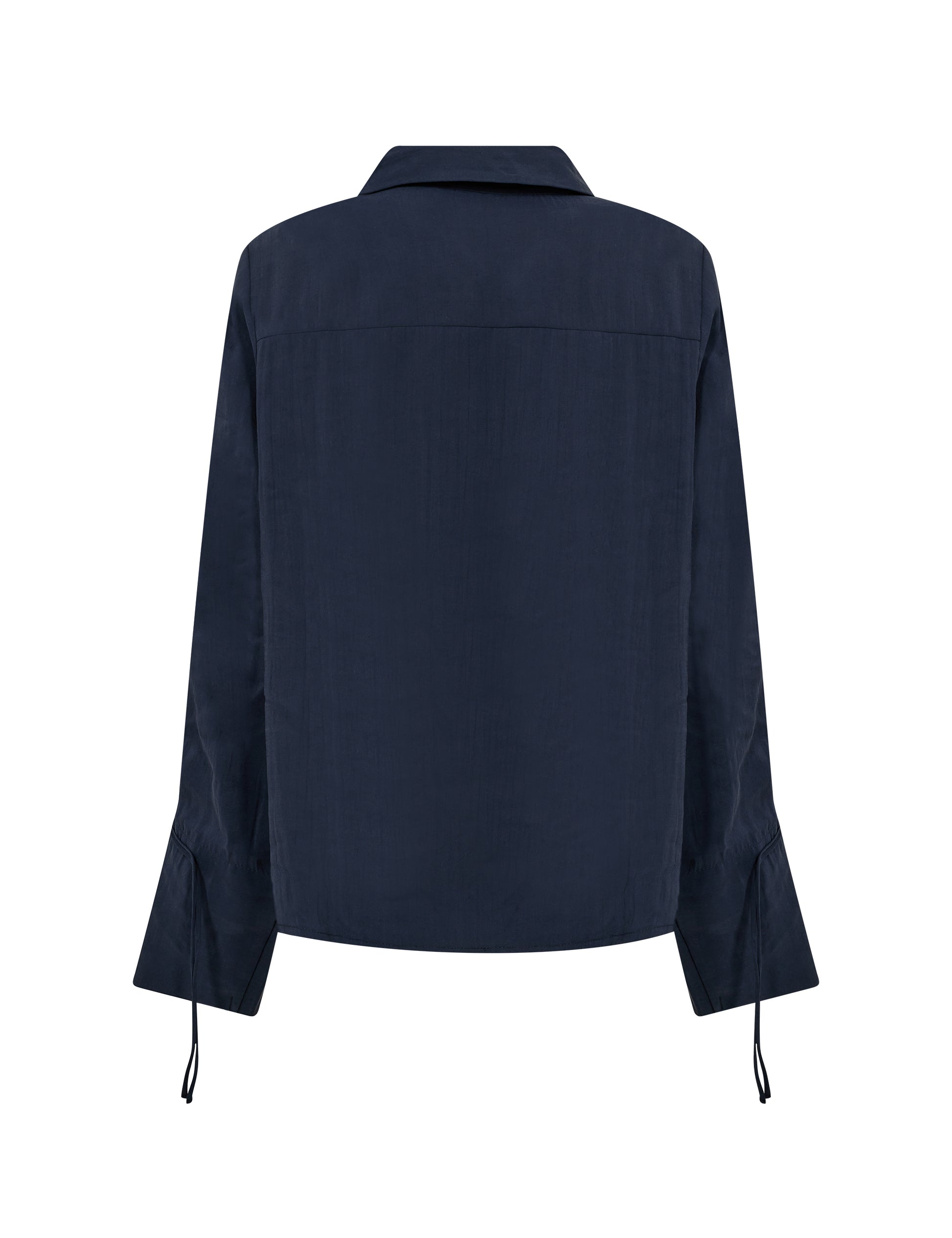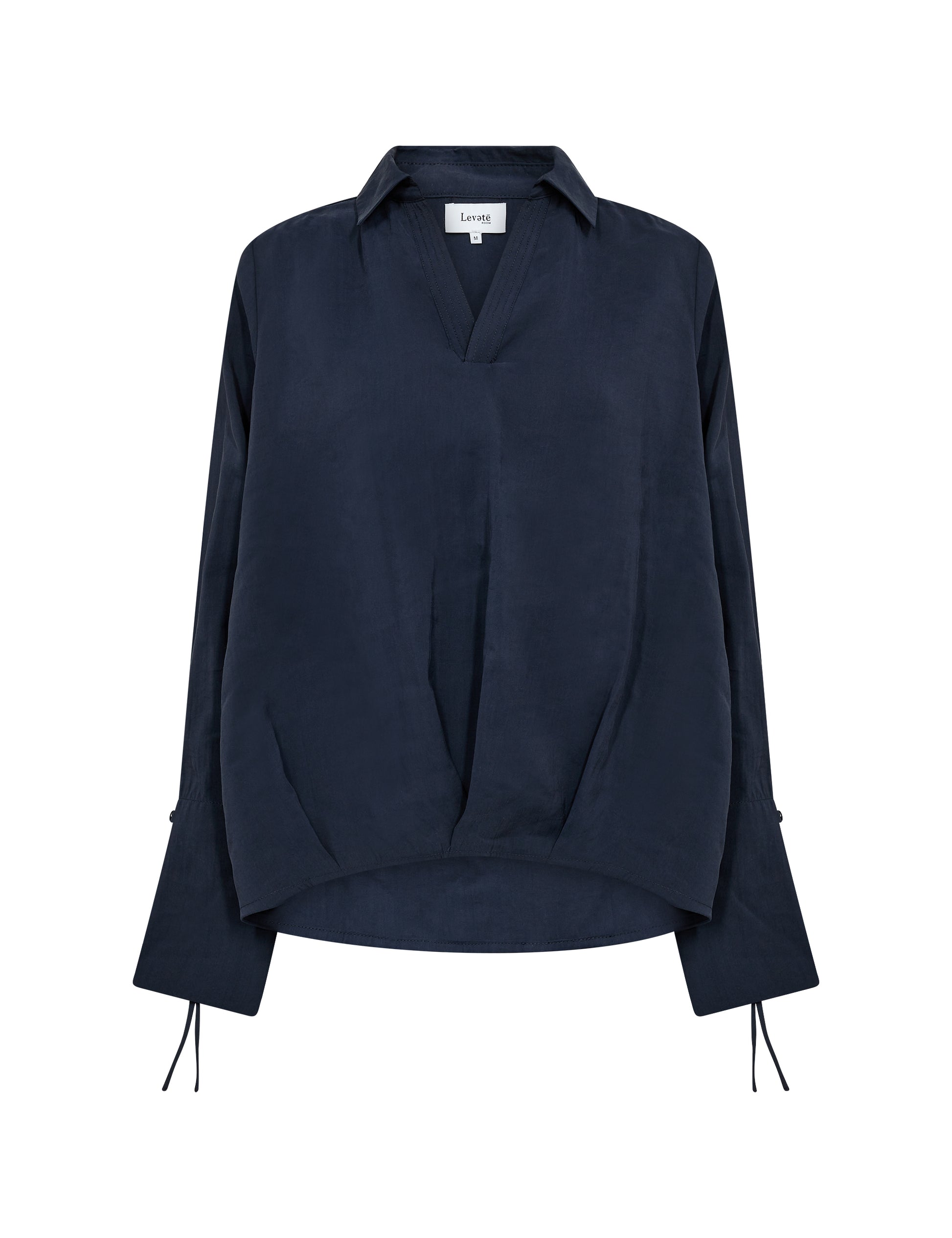Vacker blus i en fin mörkblå färg. Tillverkad i ett mjukt härligt material i 89% modal. V-ringad hals med klassisk krage. Lös passform med lång vid ärm. Fin knäppning och knytdetalj vid ärmslut.