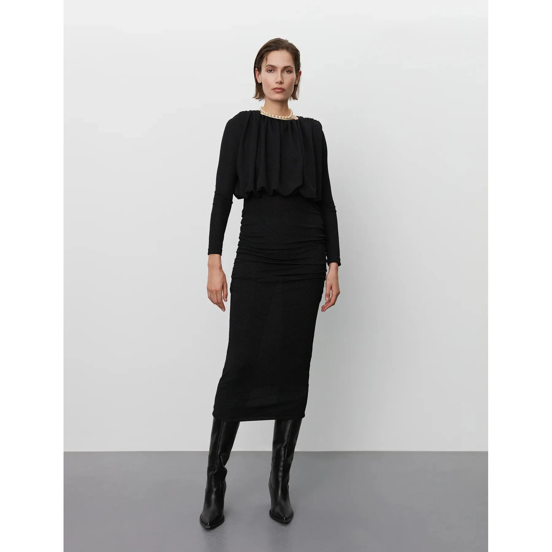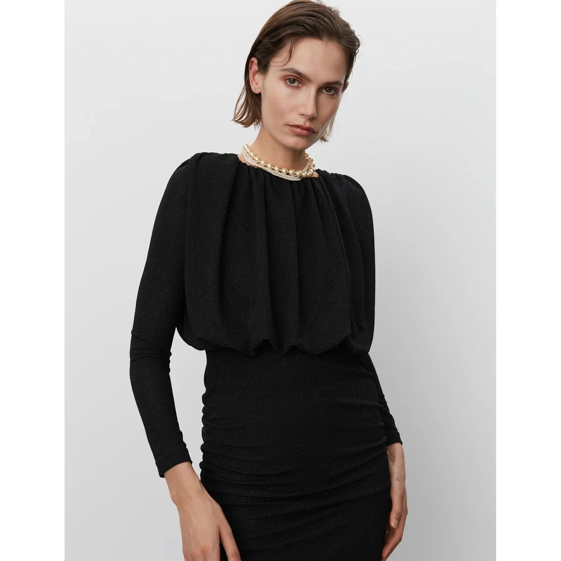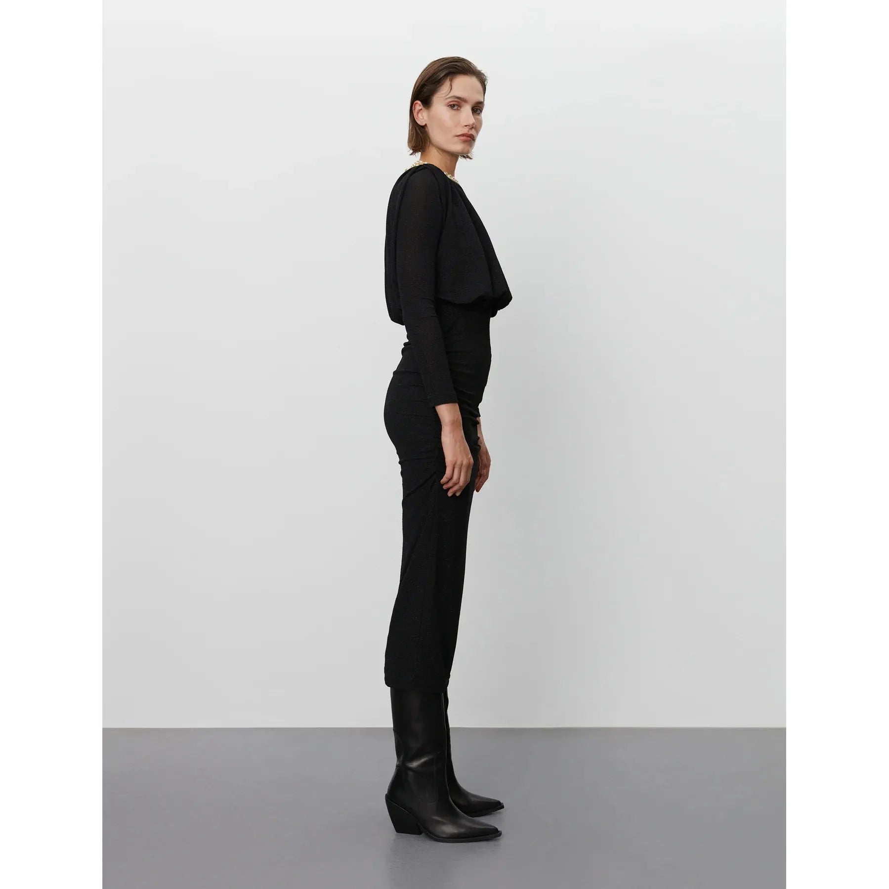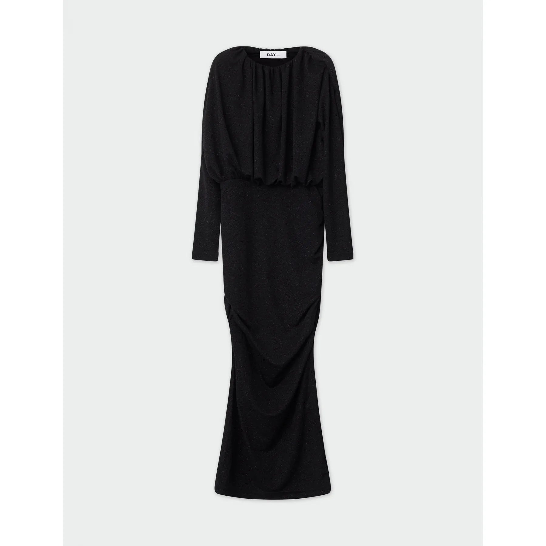 Glittrig svart maxi-klänning från DAY Birger ét Mikkelsen. Figurnära stretchig klänning med resår vid midja & hals. Rundad hals & axelvaddar som skapar ett tufft intryck.