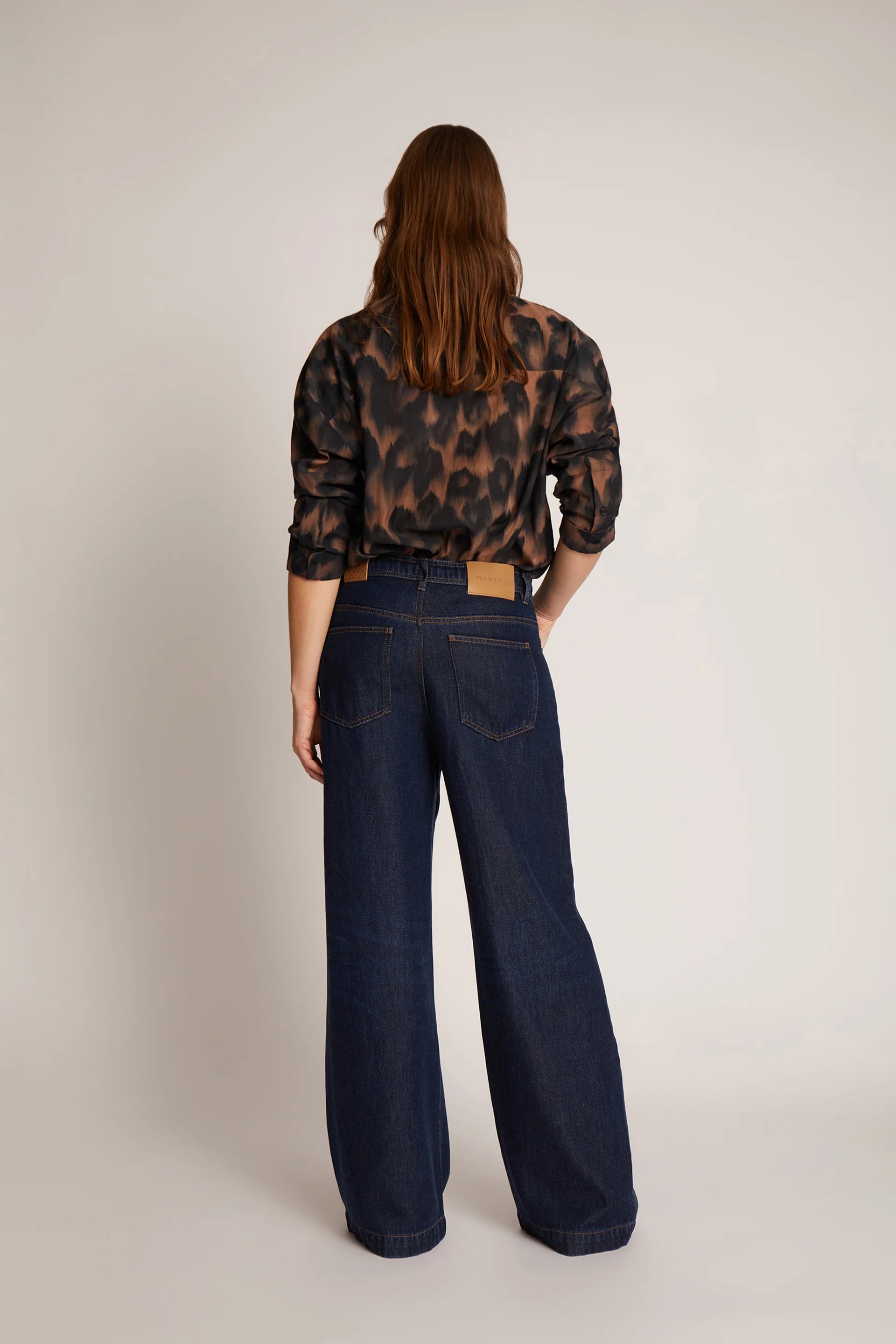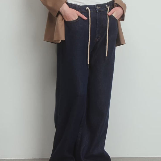 Mörkblå vida jeans i 100% tencel. Hög midja med tuff dragskodetalj. Lång modell med en lös passform i ett otroligt mjukt material. Fram- och bakfickor.