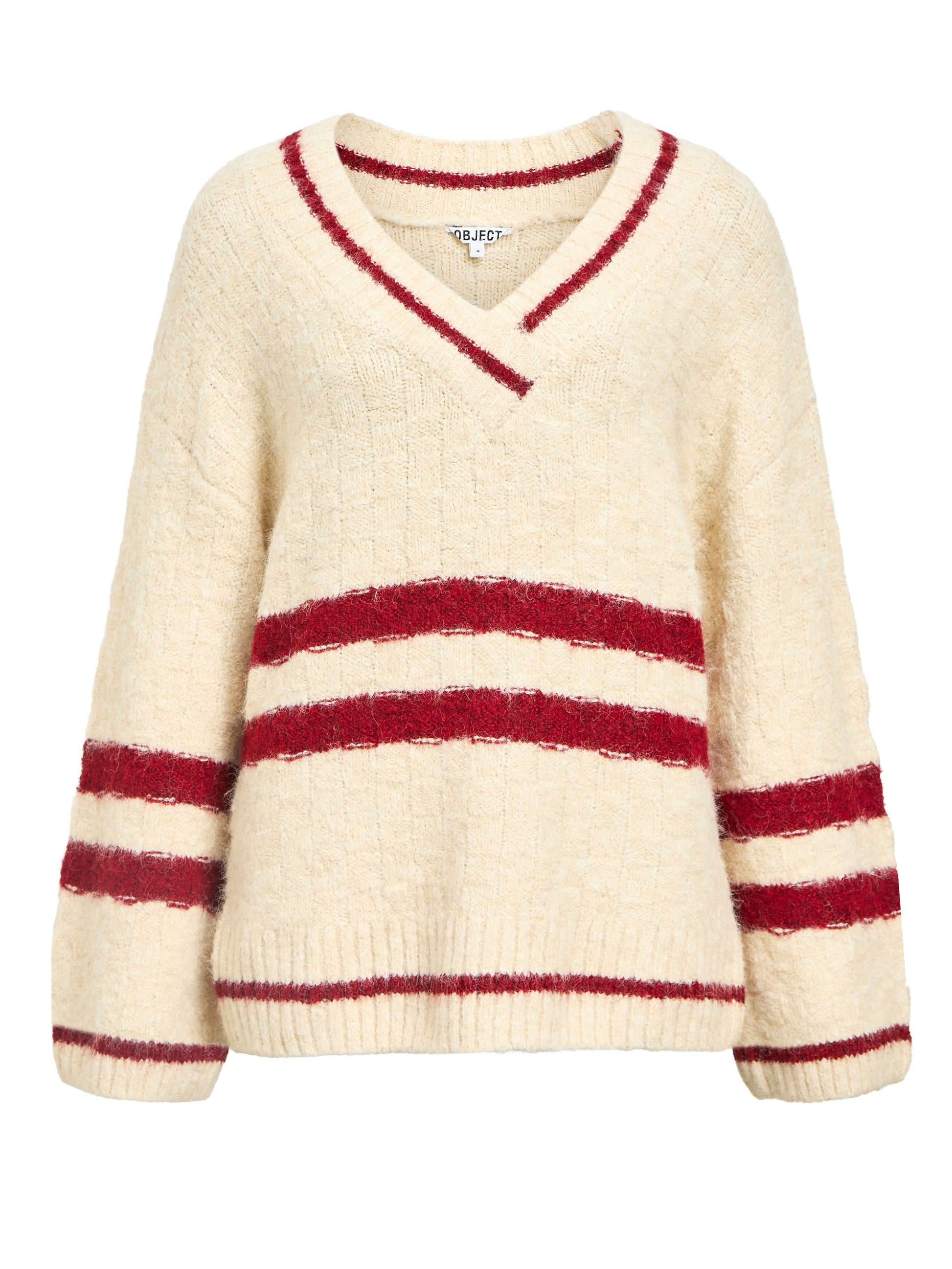 Cremefärgad stickad tröja med härliga röda ränder. Tröjan har en längre rakpassform med långa vida ärmar. Den djupt v-ringade halsen gör att tröjan passar perfekt att bära över en skjorta så att kragen kan sticka fram!