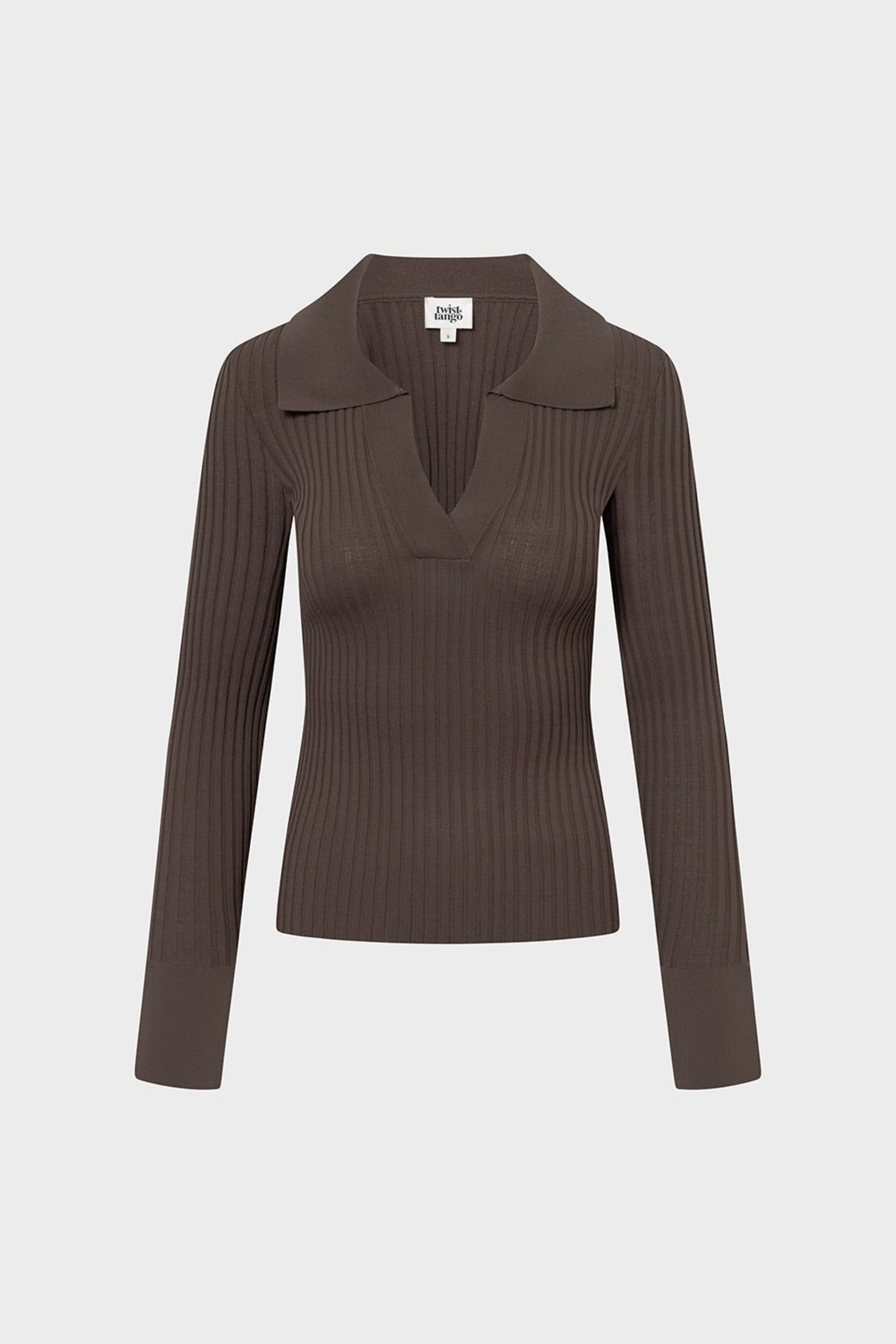 Brun långärmad top i ett fint tunt ribbat material. V-ringad hals och en dekorativ krage. Figurnära passform med utsvängda trumpetärmar.