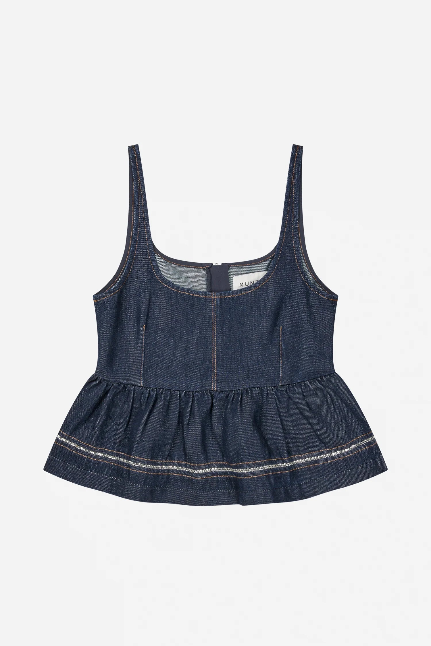 Söt top i mörkblå denim med fina strass-stenar. Smala axelband och en djupt rundad hals och nacke. Markerad midja med sväng nederdel. förslutning med dragkedja i ryggen.