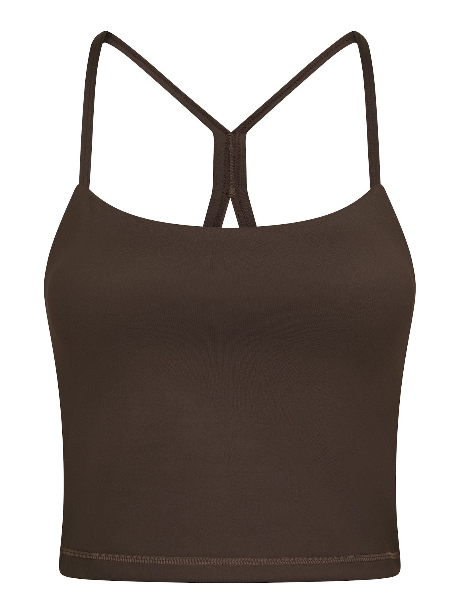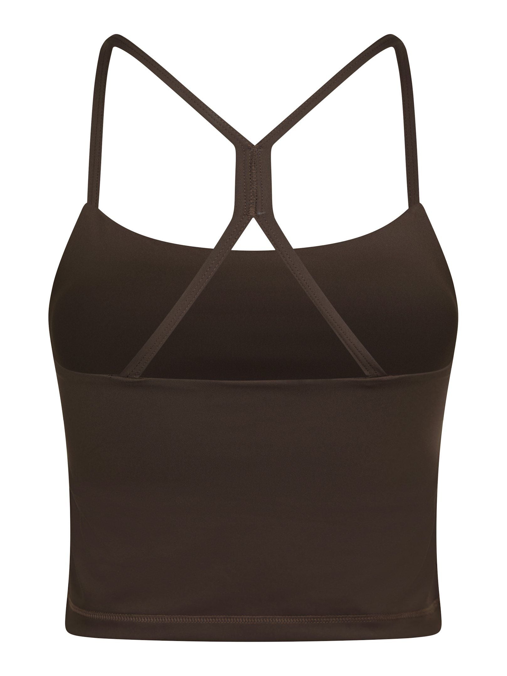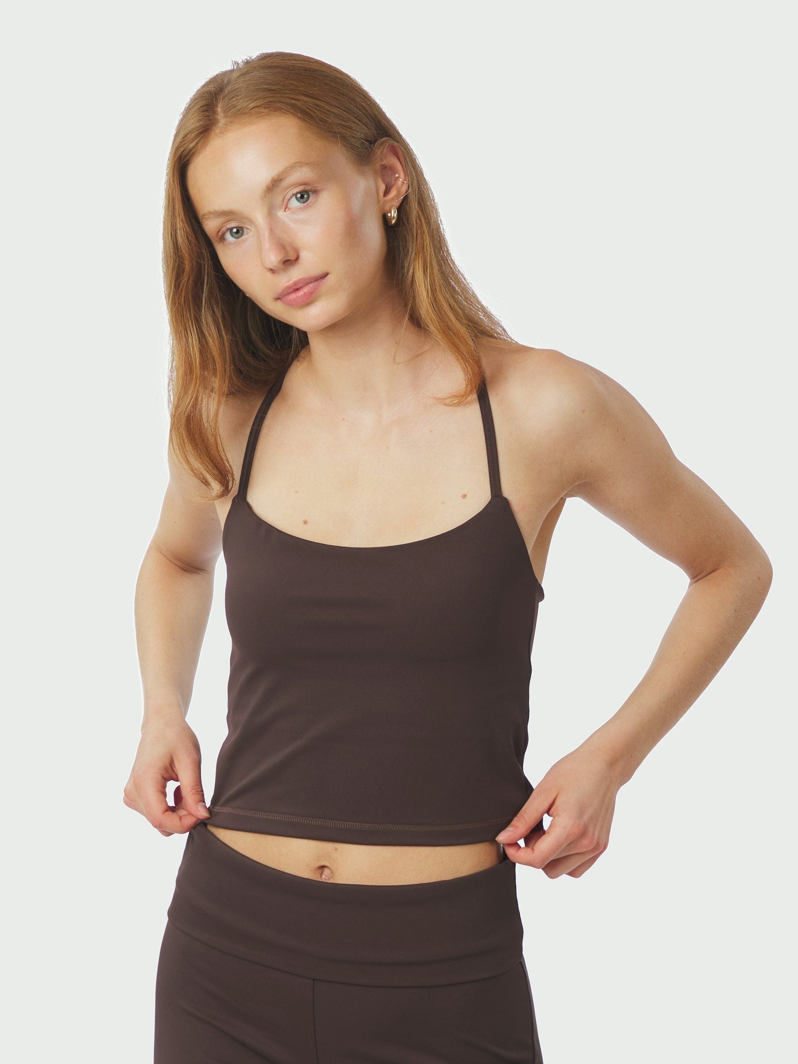 Brunt linne/sporttop i ett mjukt stretchigt material. smala axelband med kors i ryggen. Kort figurnära passform.