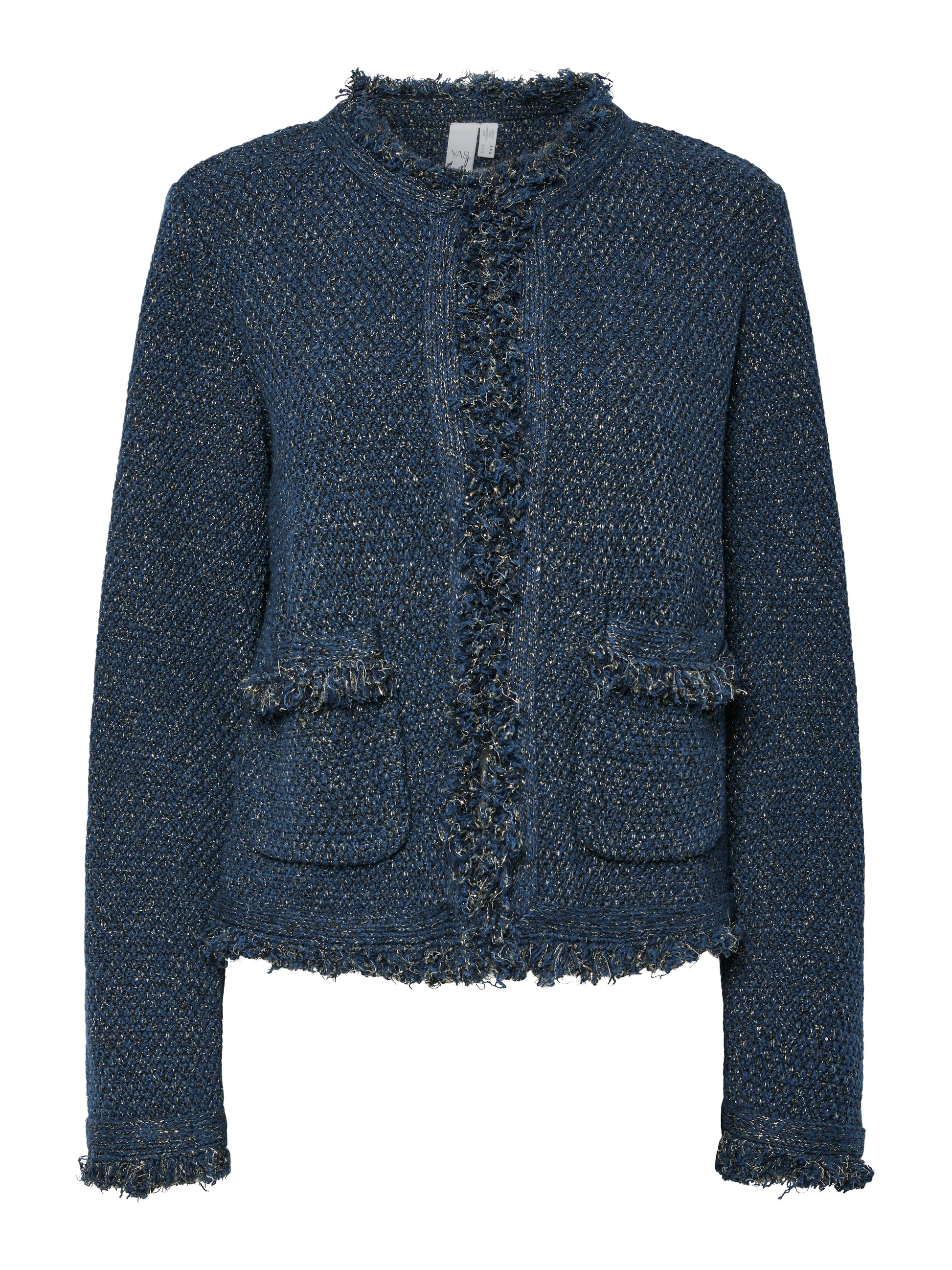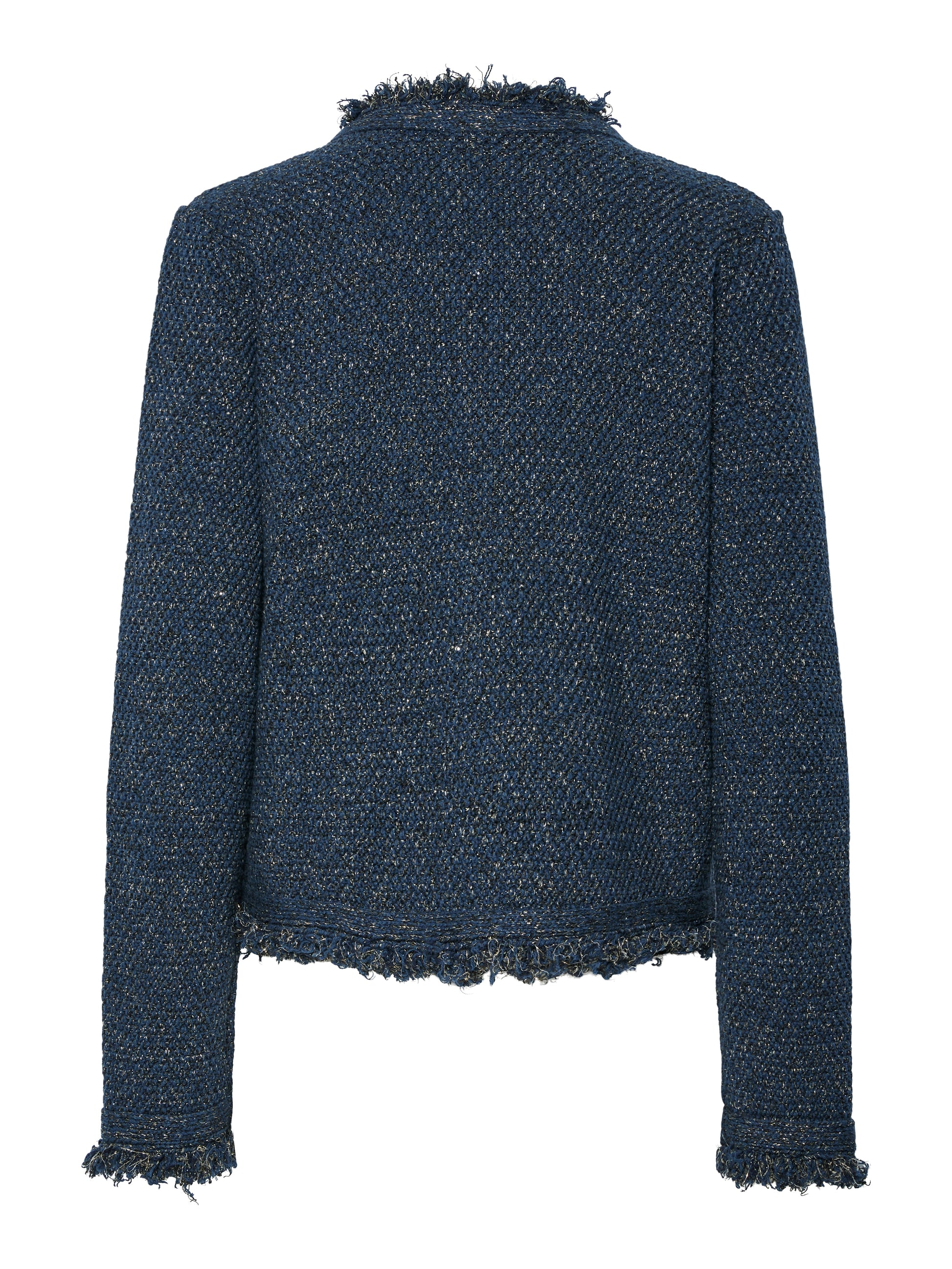 Mörkblå stickad blazer/kofta med glittriga insydda trådar. Denna kavajliknande kofta har en rak lös passform. Knäppning längst med koftan framtill med snygg fluffig kant. Dekorativa framfickor och lång ärm.