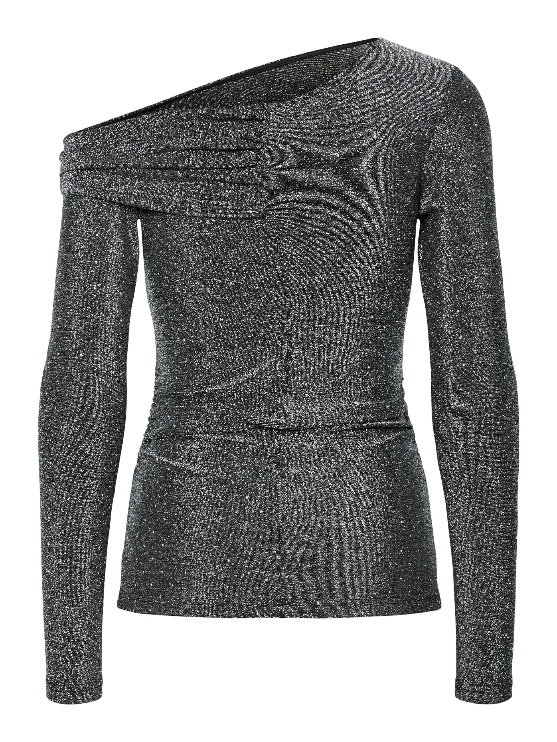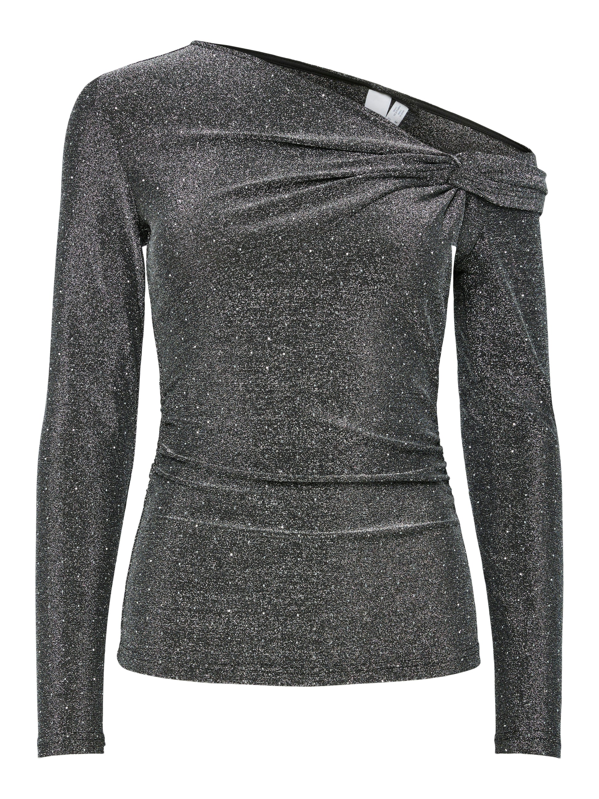 Silvrig långärmad top med små glittriga strasstenar. Sned halsskurning med snygg knytdetalj framtill vid ena axeln.